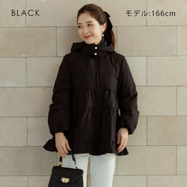ふんわり軽やかな着心地でありながら、寒さからしっかり守ってくれるフリルダウンジャケットでティアードのように切り替えられたフリルが女性らしさを添え冬の装いに華やぎをプラスします。