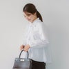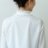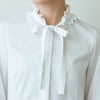 衿元のフリルとリボンが顔まわりを華やかに演出するフェミニンブラウスです。