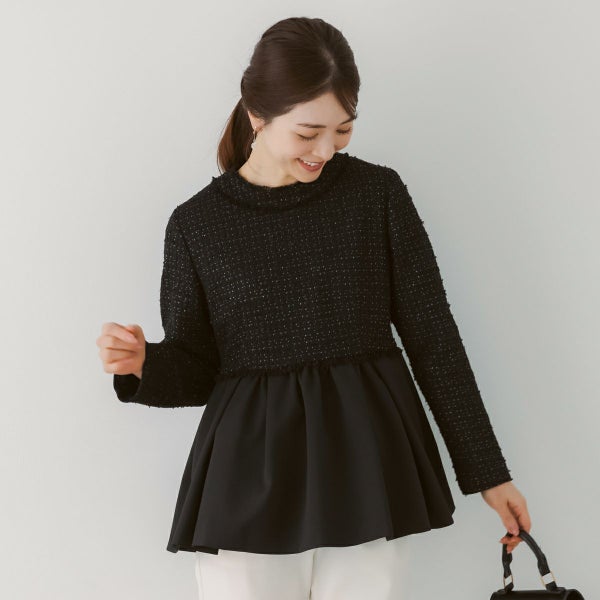 クラシックなウール混のニットツイードに、ダブルクロスのペプラムを切り替えたチュニックブラウスです。