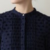 首元には繊細なピンタックとパール釦をあしらい、上品さの中にやさしい華やぎをプラスしてくれます。