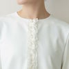 前身頃には立体的に重ねたフリルとパールをあしらい、顔まわりを華やかに演出。