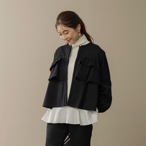 ふっくらと立体的なフリルが目を惹くショート丈ブラウスです。