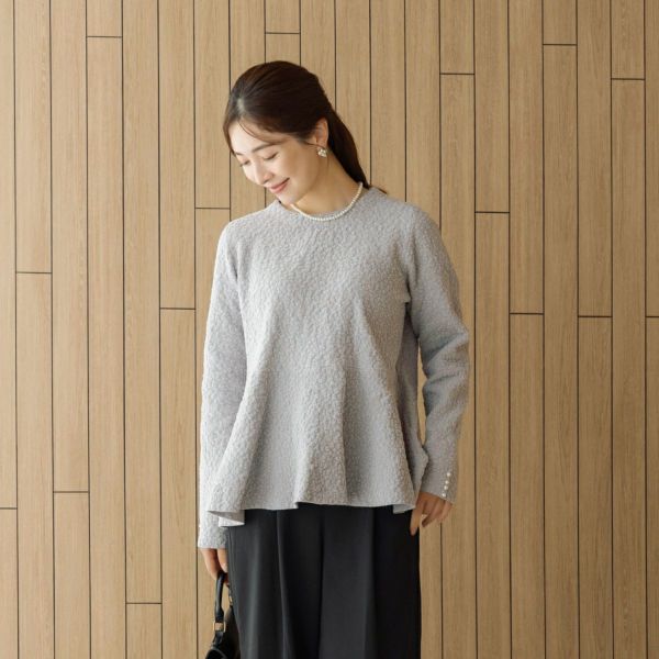 きらきらした光沢のモール糸とハイパーストレッチ糸を組み合わせた立体感のあるジャカード編みが上品な表情を生むニットプルオーバーです。