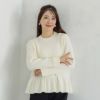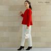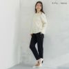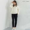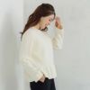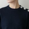 肩には立体的なモチーフが煌めき、シンプルなボトム合わせでも華やかに着映えする大人の華やかデイリーニットです。