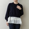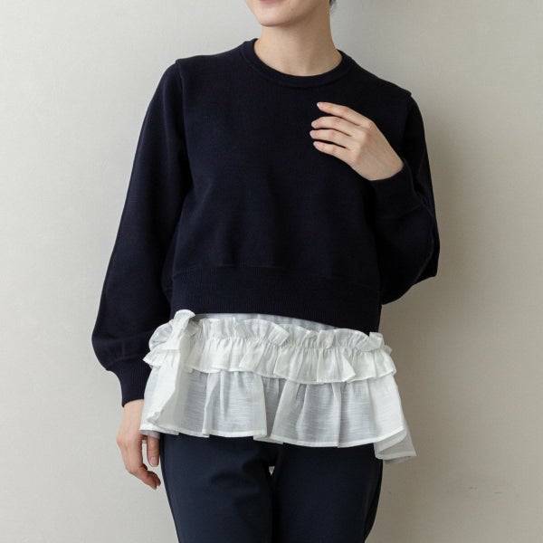 こちらのチュニックはふんわりとしたニットの柔らかさに、花びらのように揺れる布帛フリルを重ねた、一枚で春映えする主役トップスです。