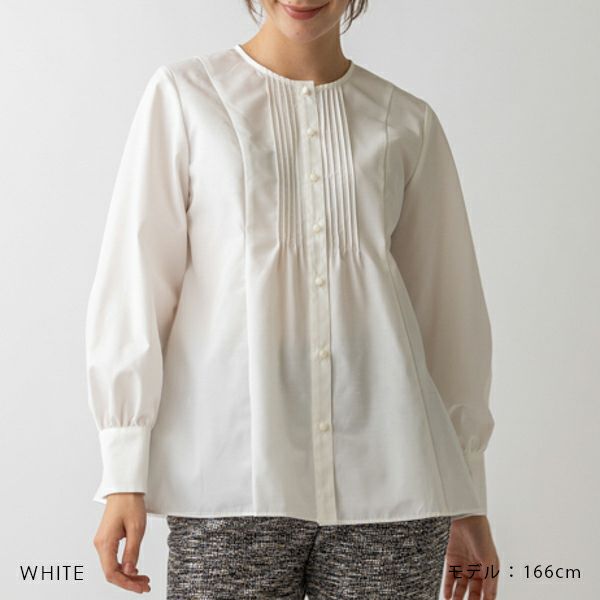 ほど良くデザインされたAラインシルエットの着回しブラウスです。