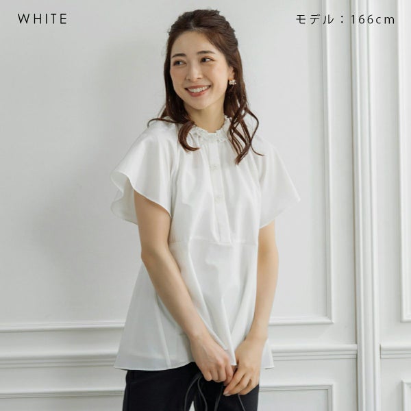 上品なフリルカラーとビジューディテールが映えるチュニックブラウス。