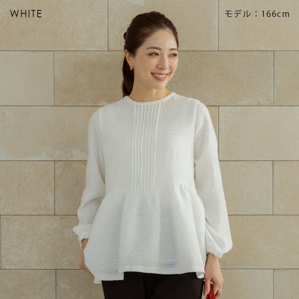 フロントに施したピンタックと、ふんわり広がるペプラムが織りなす立体的なシルエットは 歩くたびにやわらかな揺らぎを生み、さりげなく女性らしい余韻を残します。