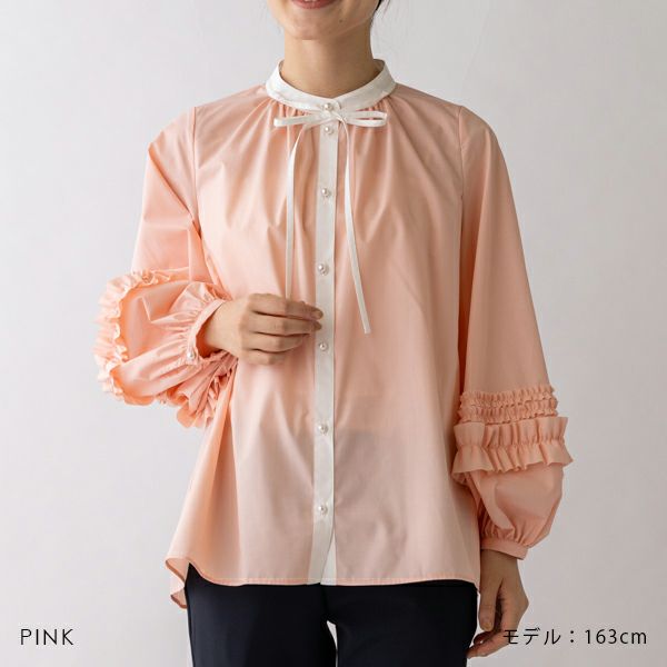 女性らしいしなやかなギャザーフレアシルエットとボリューム感のあるパフスリーブに施されたギャザーフリルが特徴のブラウスです。