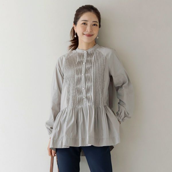前身頃のタックを活かしたべプラムフレアシルエットが印象的なチュニックブラウスは、きちんと感がありながら、SONOらしいフェミニンシルエットが特徴です。