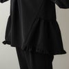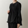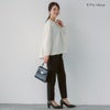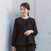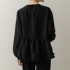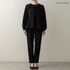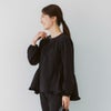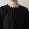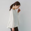首元に並んだパール調のアクセントが顔まわりを明るく映し、ふんわりと広がるバックフリルが優しくフェミニンな印象を与えてくれます。
