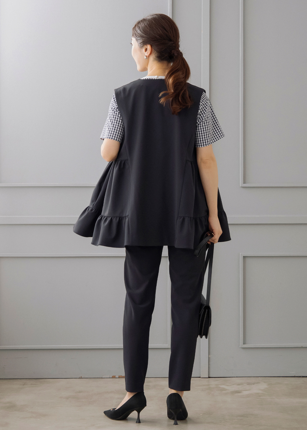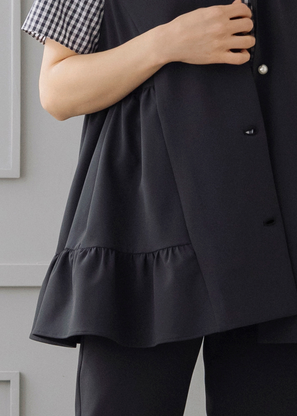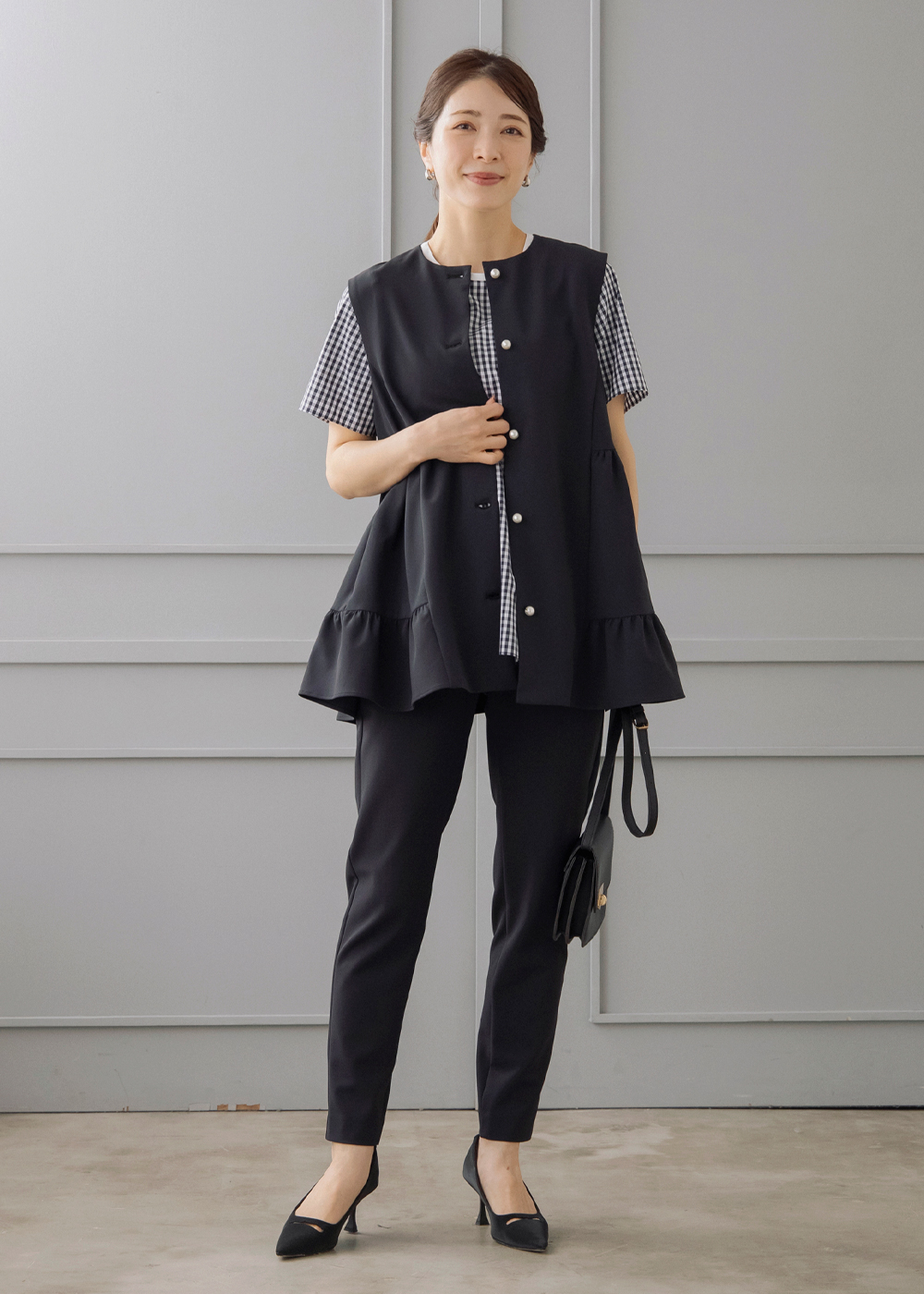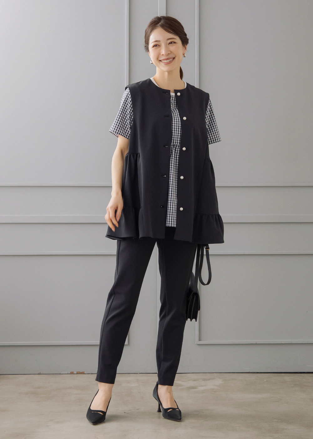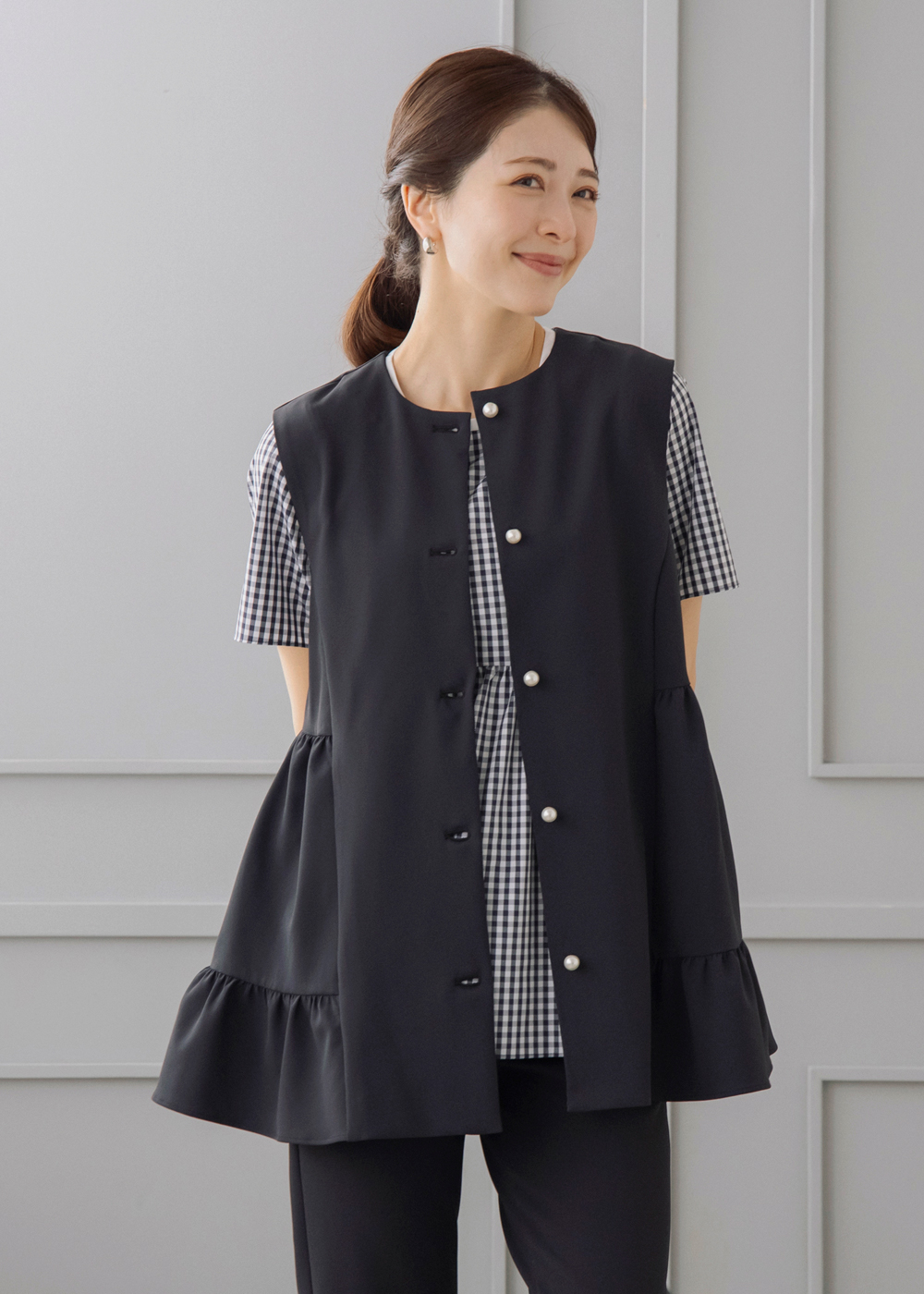 ギンガムのペプラムブラウスにジレを重ねた