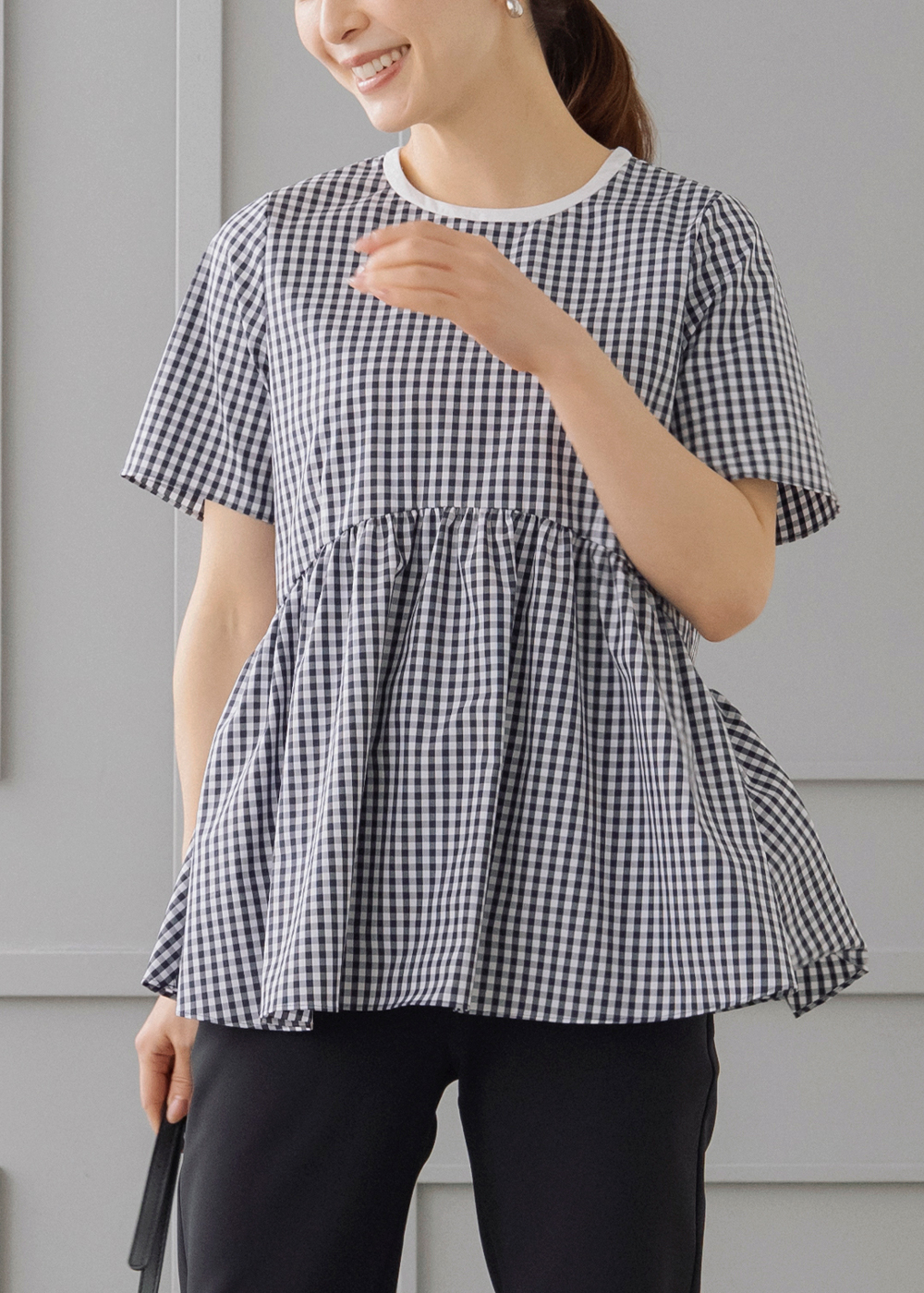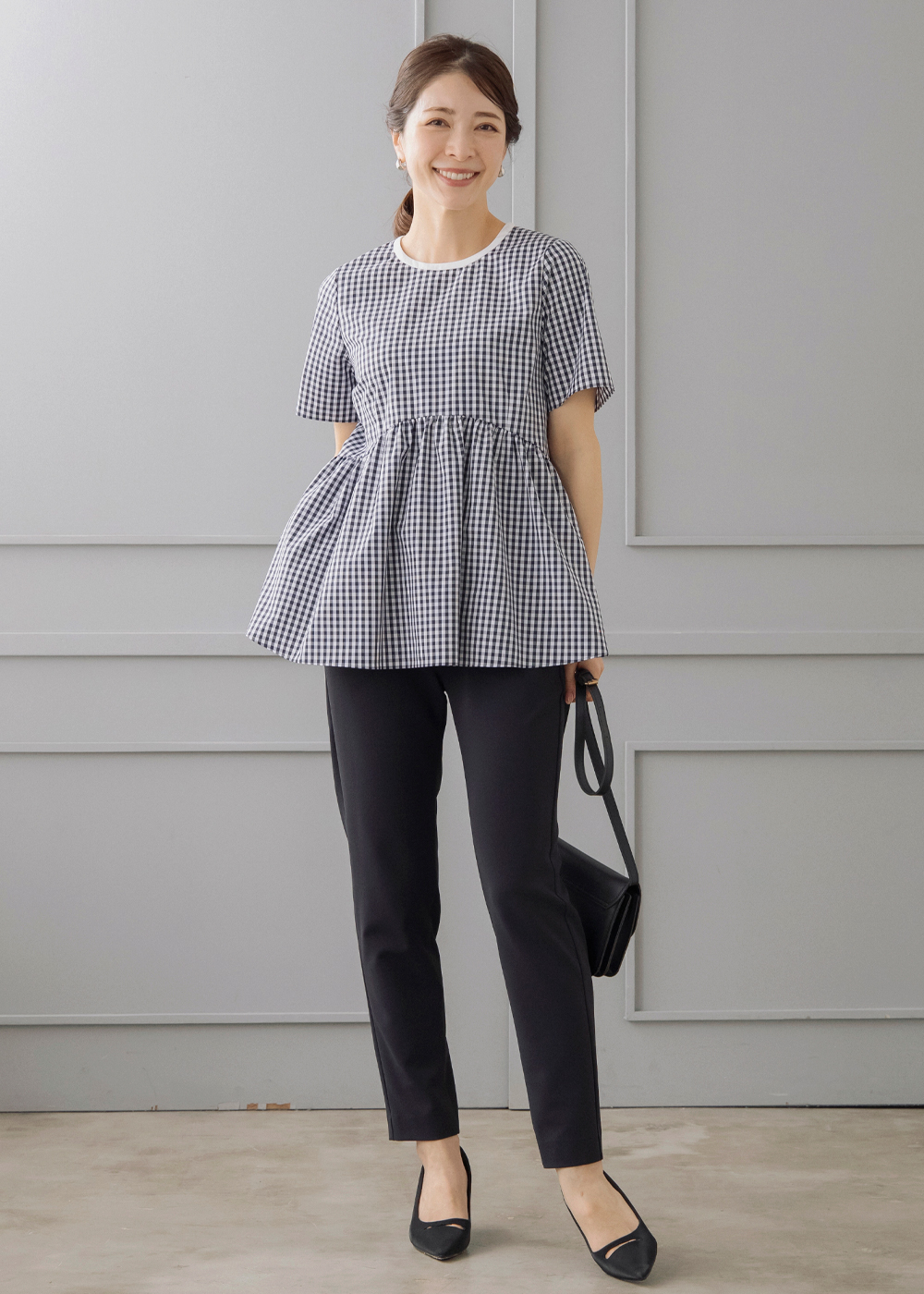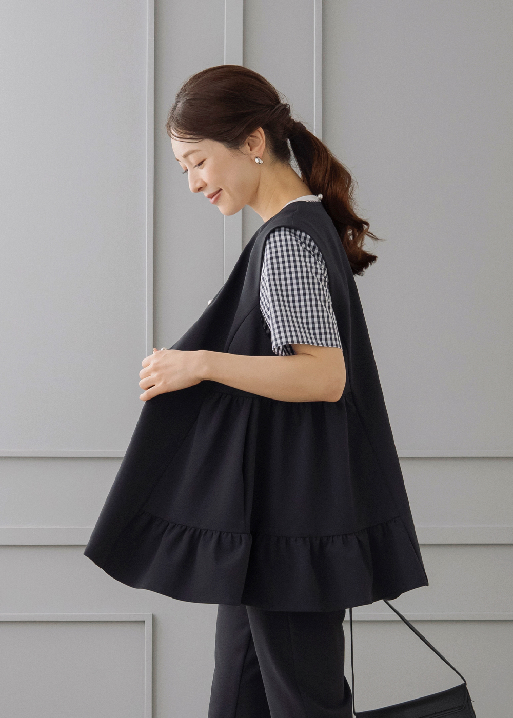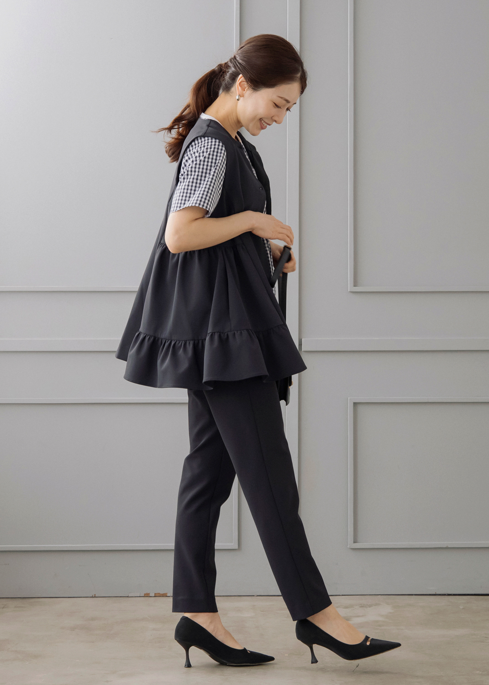 ギンガムのペプラムブラウスにジレを重ねた