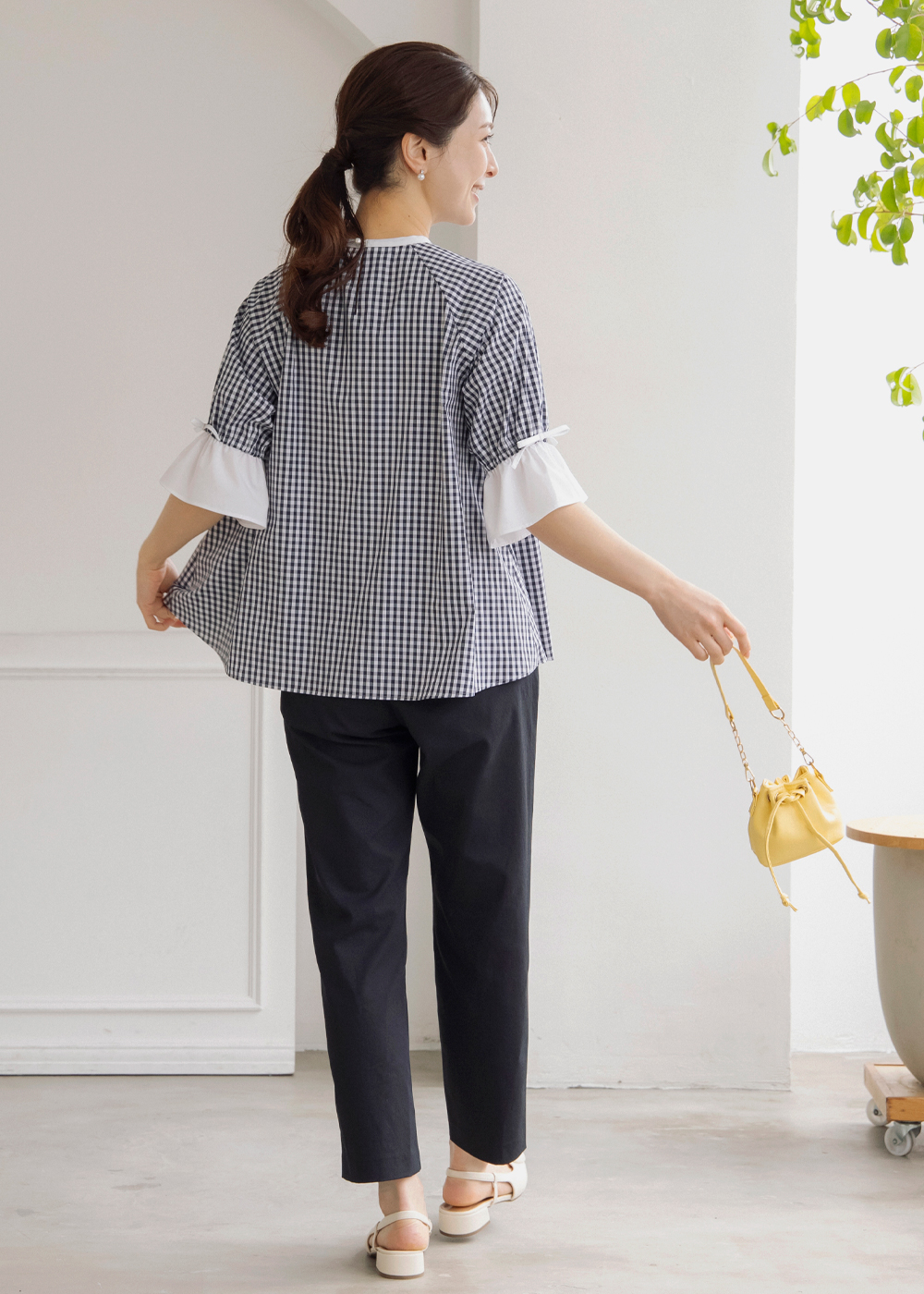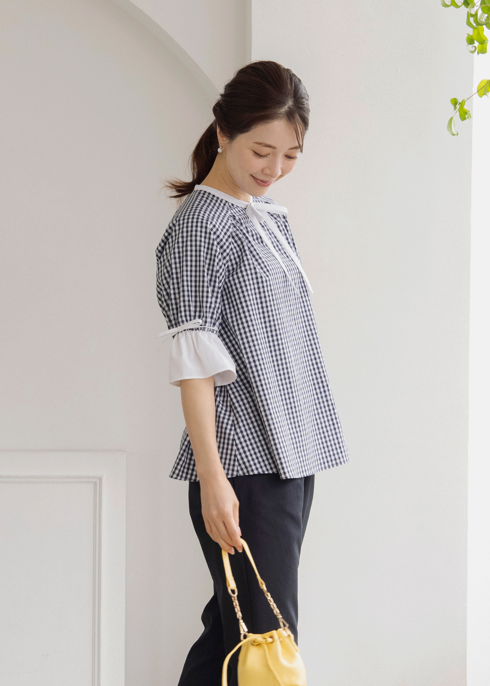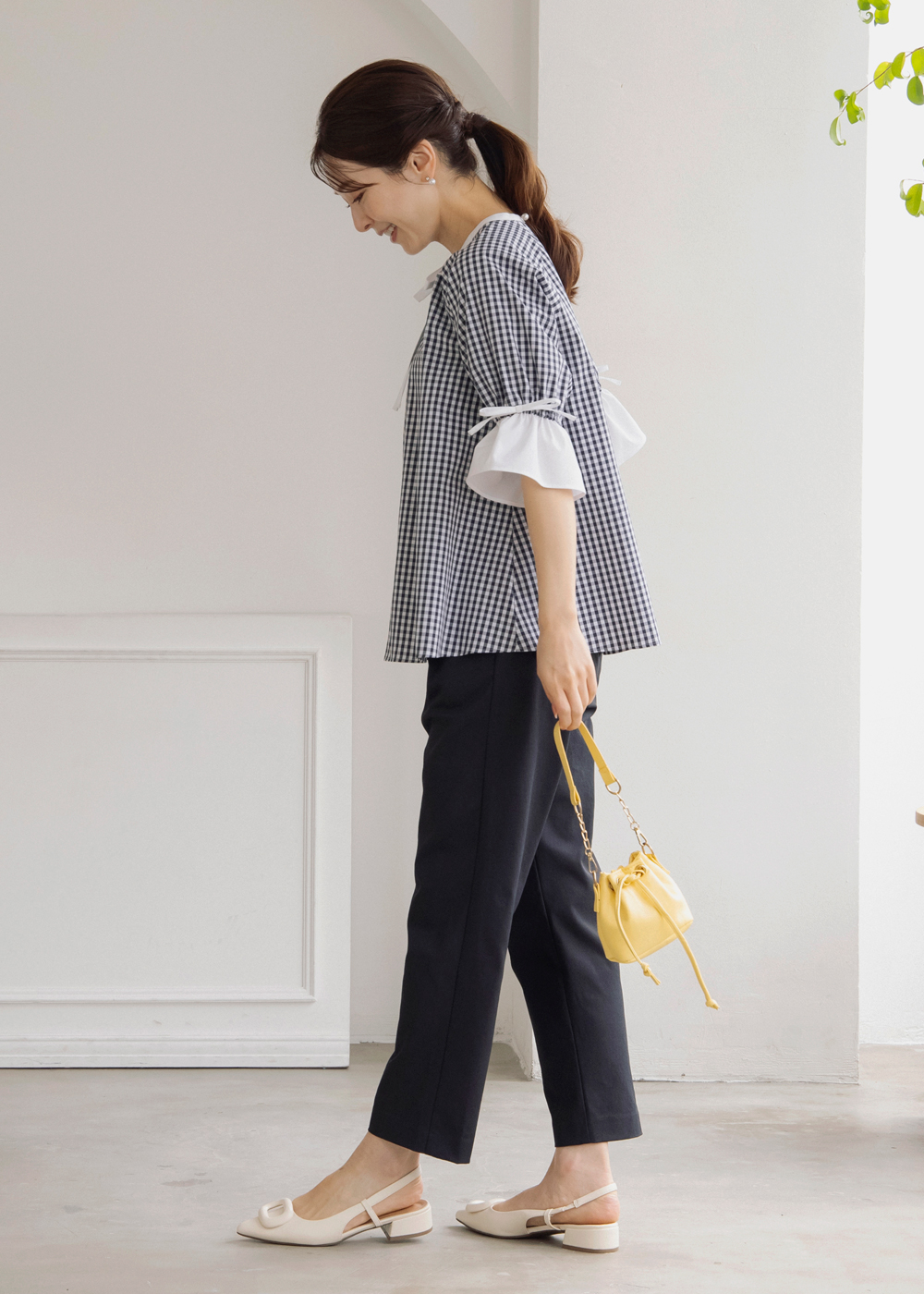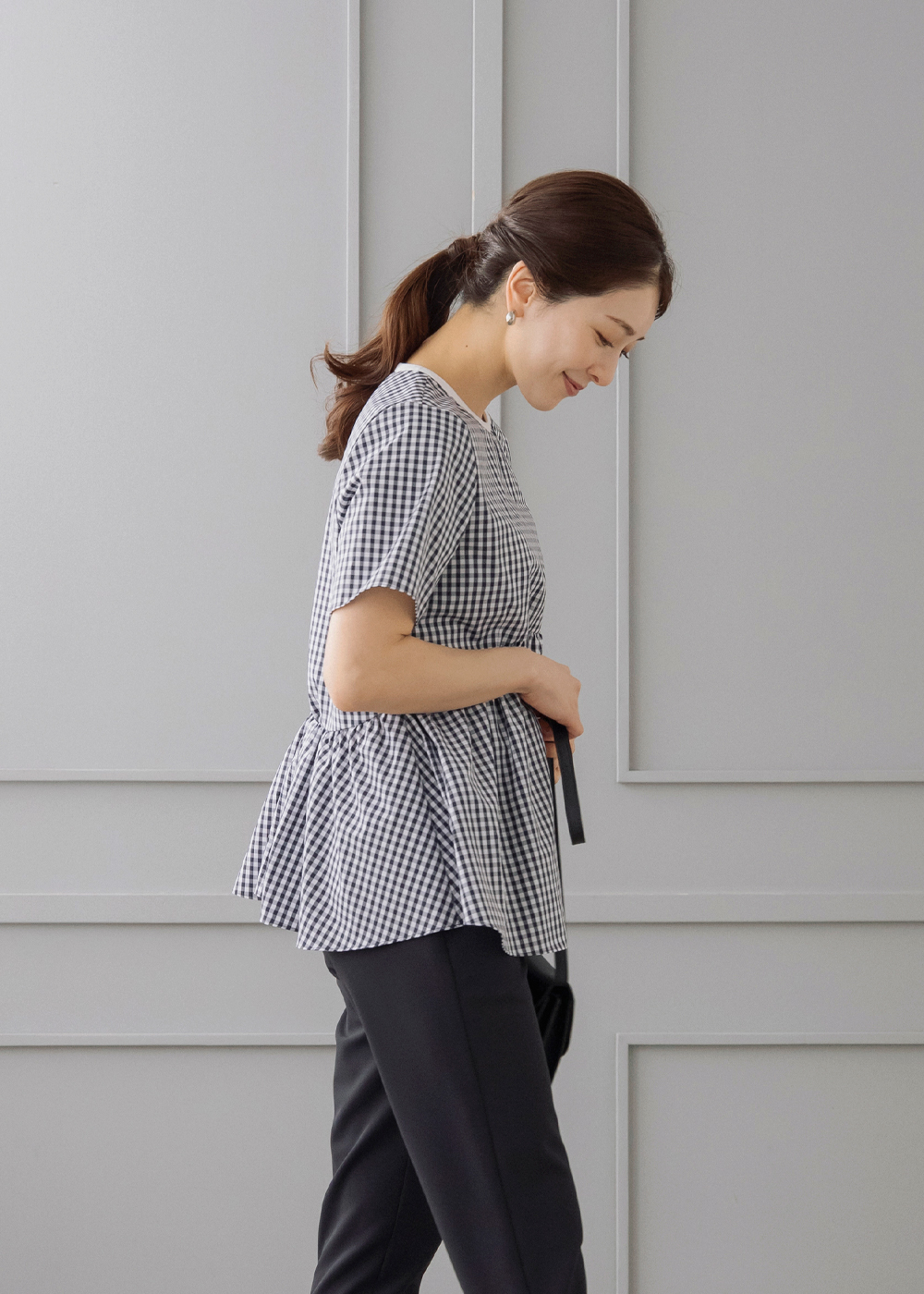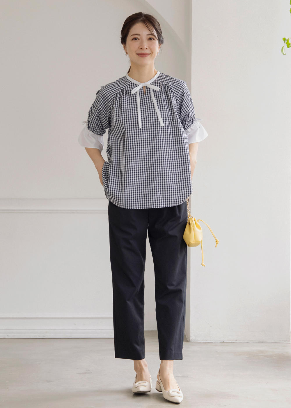 ギンガムのペプラムブラウスにジレを重ねた