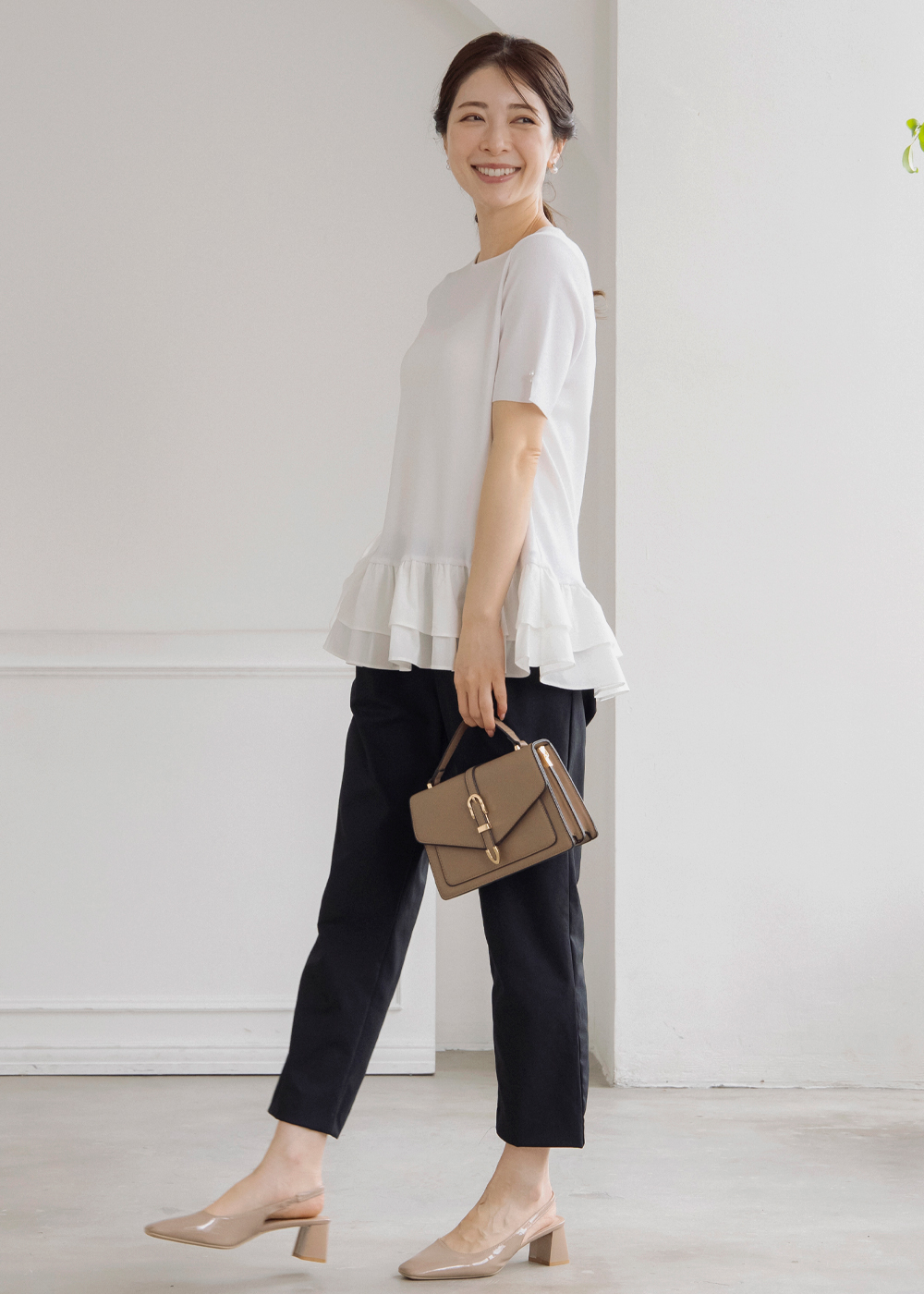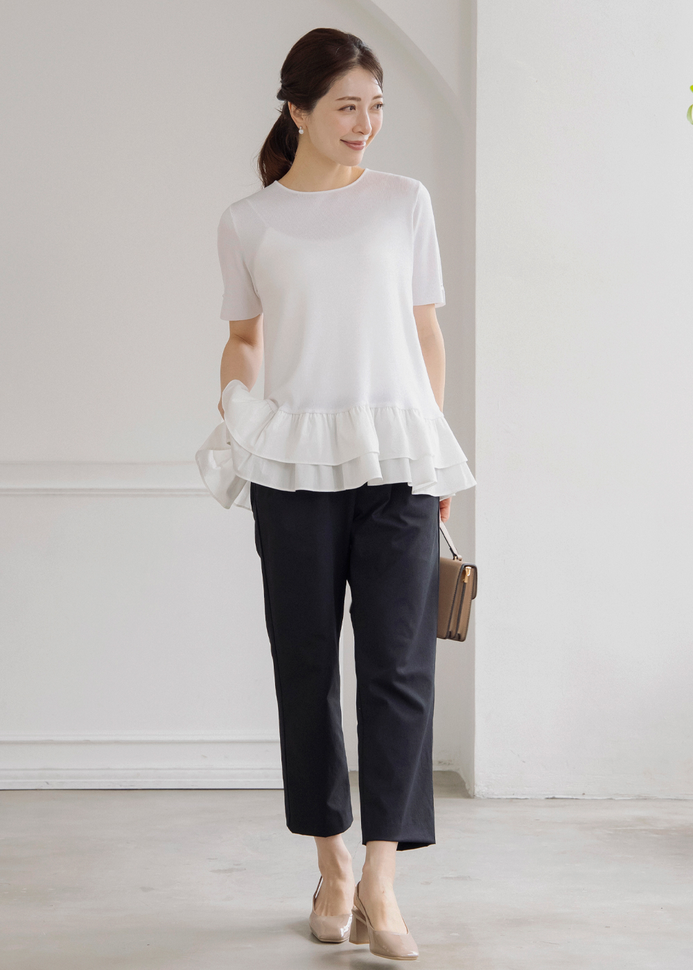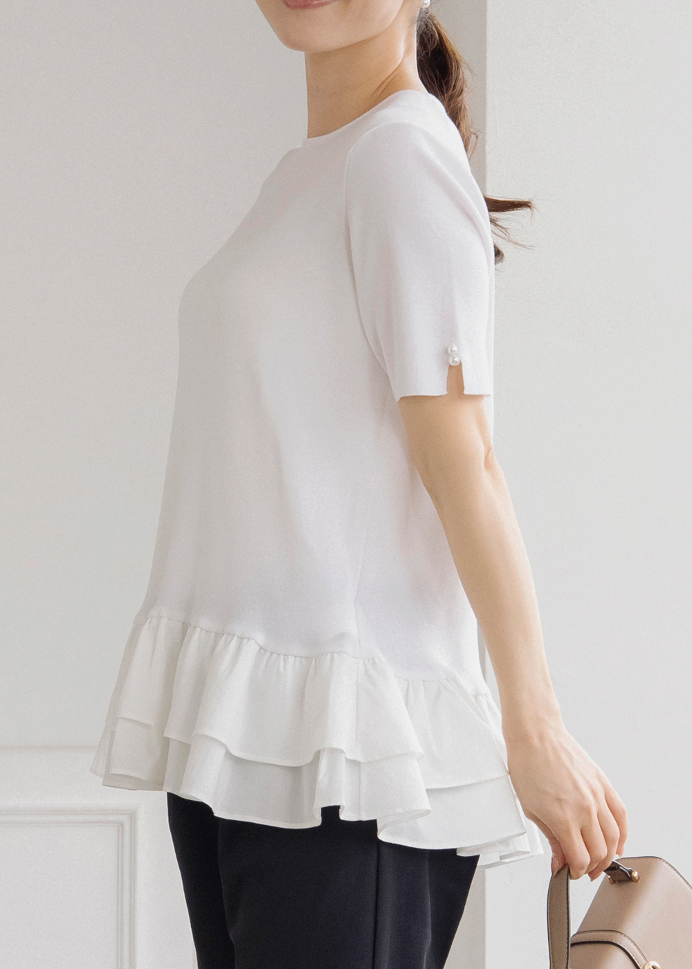 裾のふんわりフリルが女性らしさをプラスする