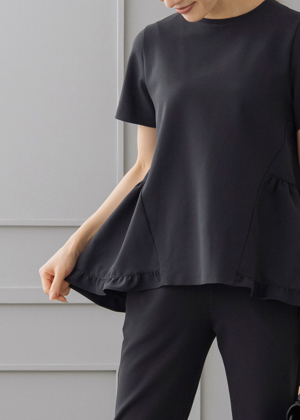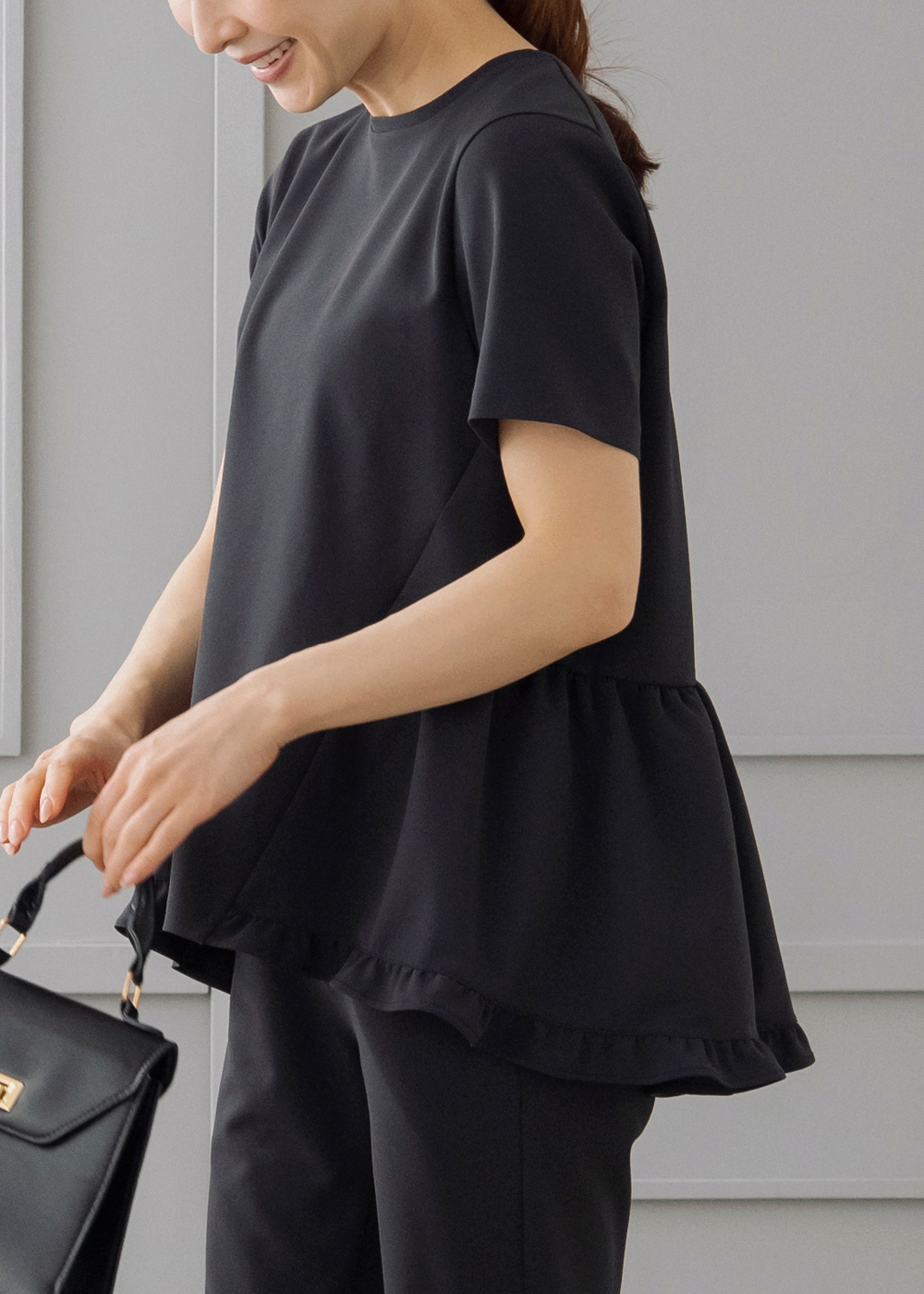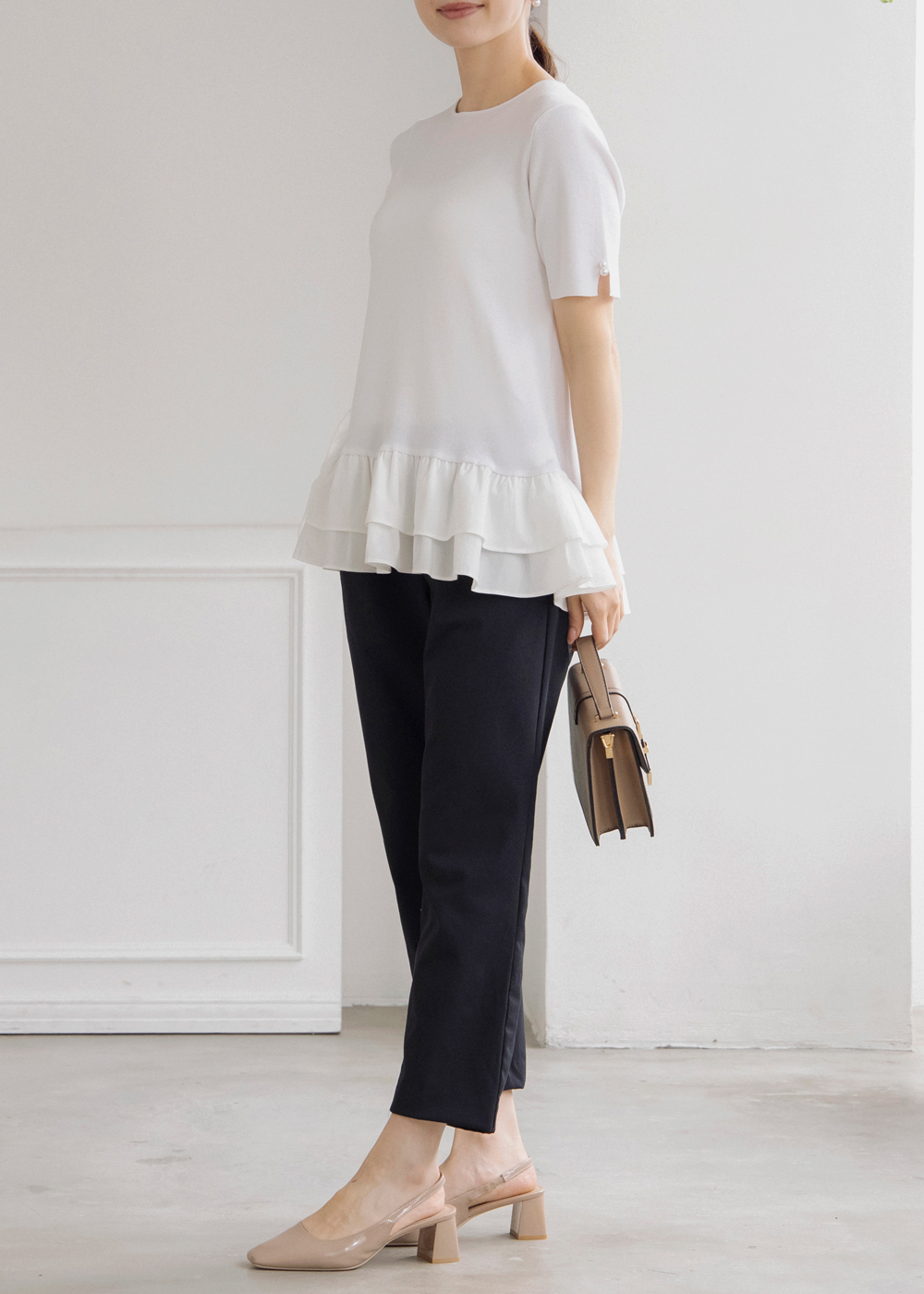 裾のふんわりフリルが女性らしさをプラスする