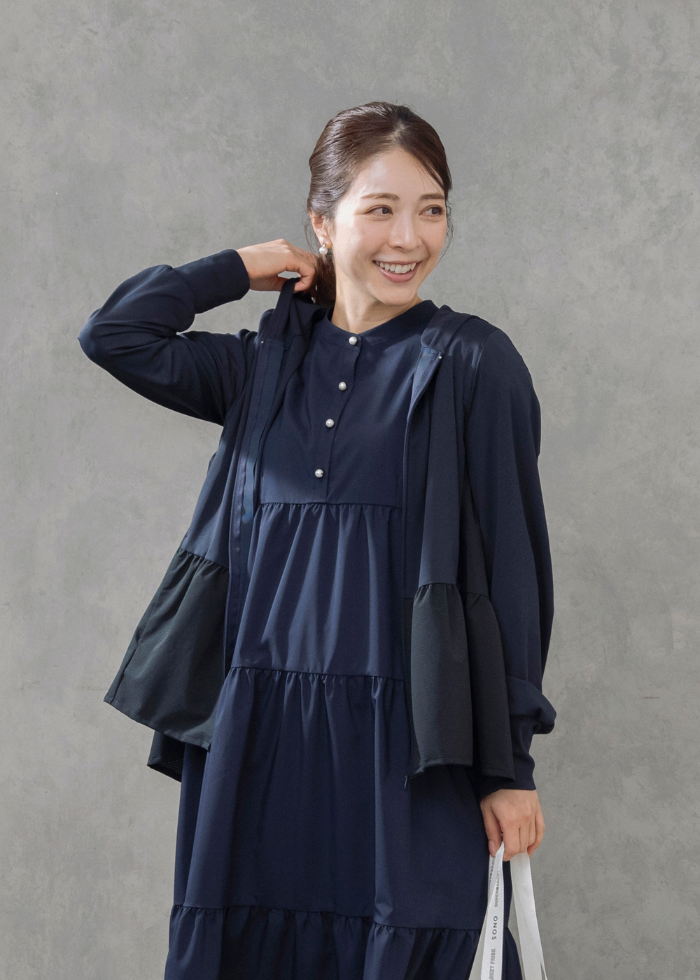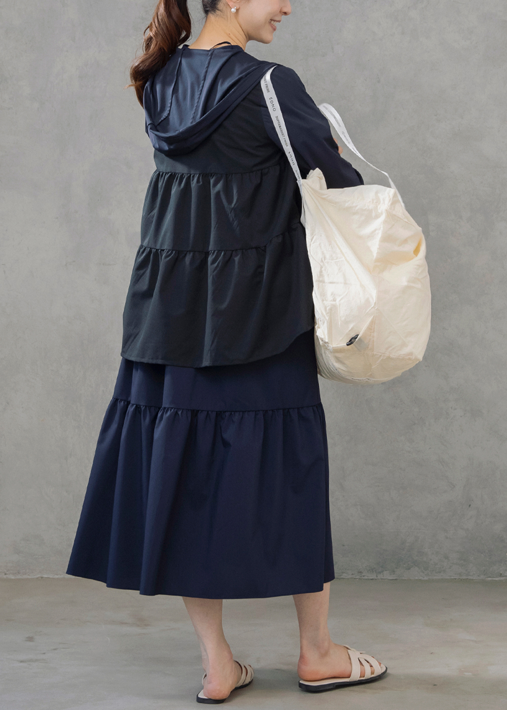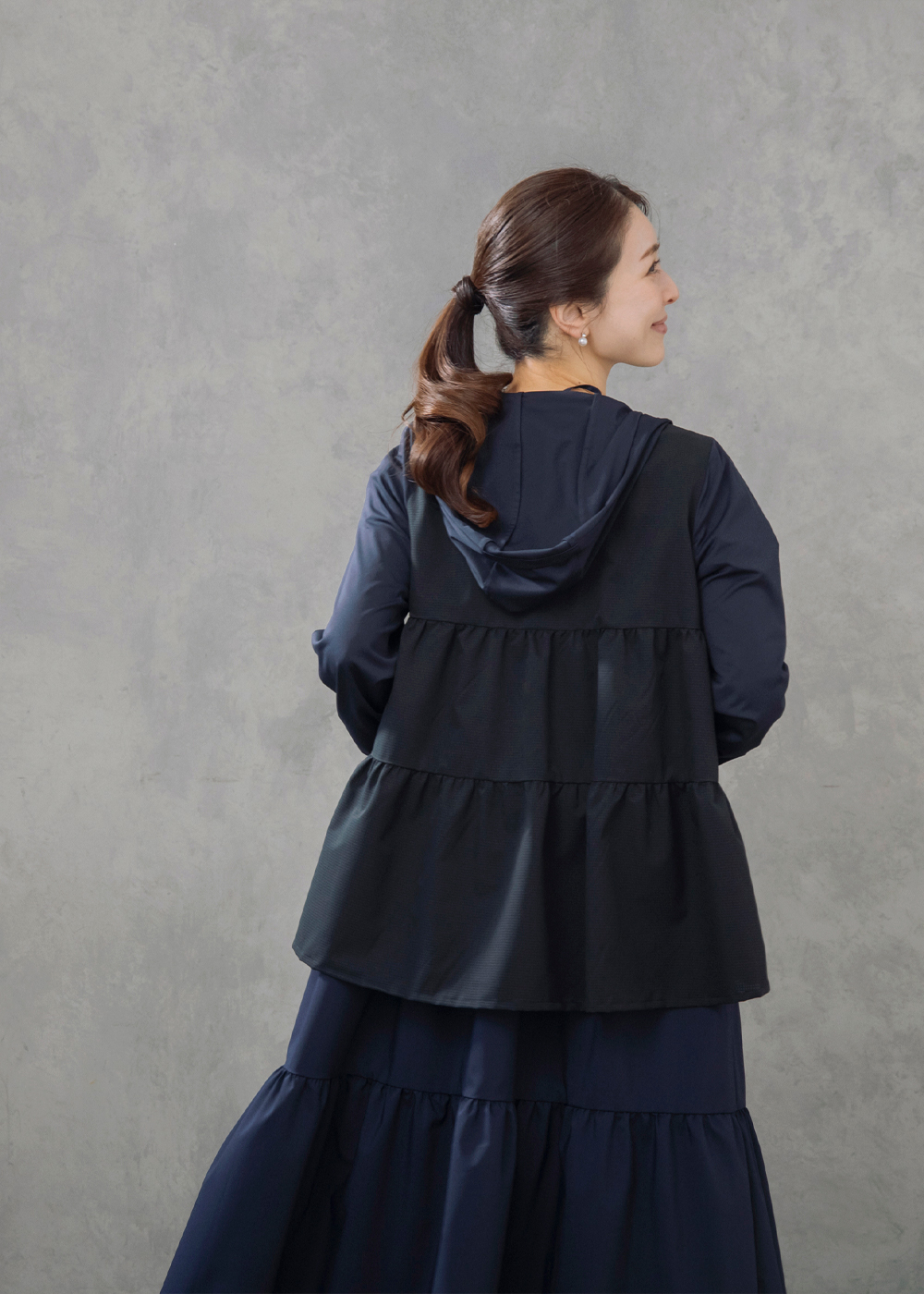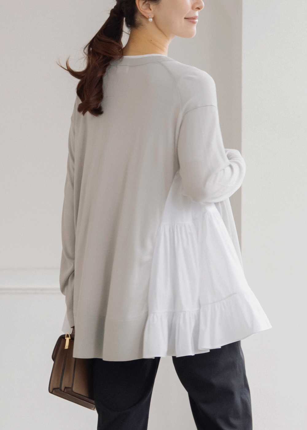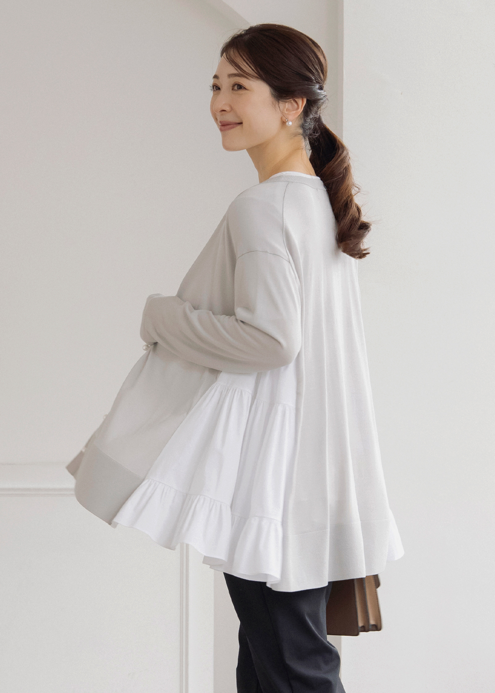 サイドティアードのチュニックカーディガンが後ろ姿まで美しく