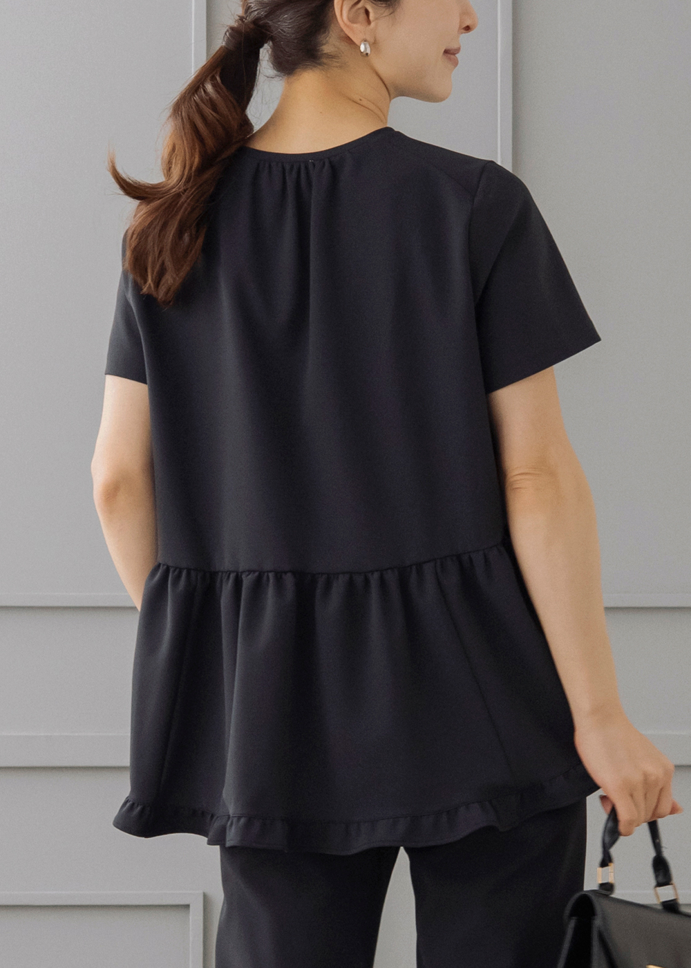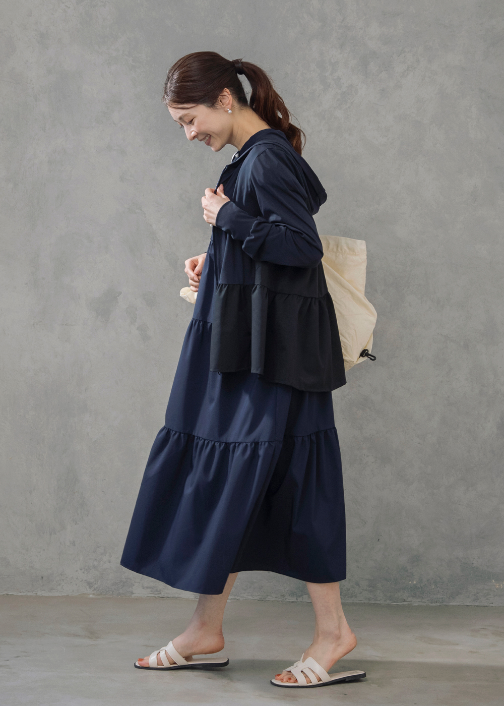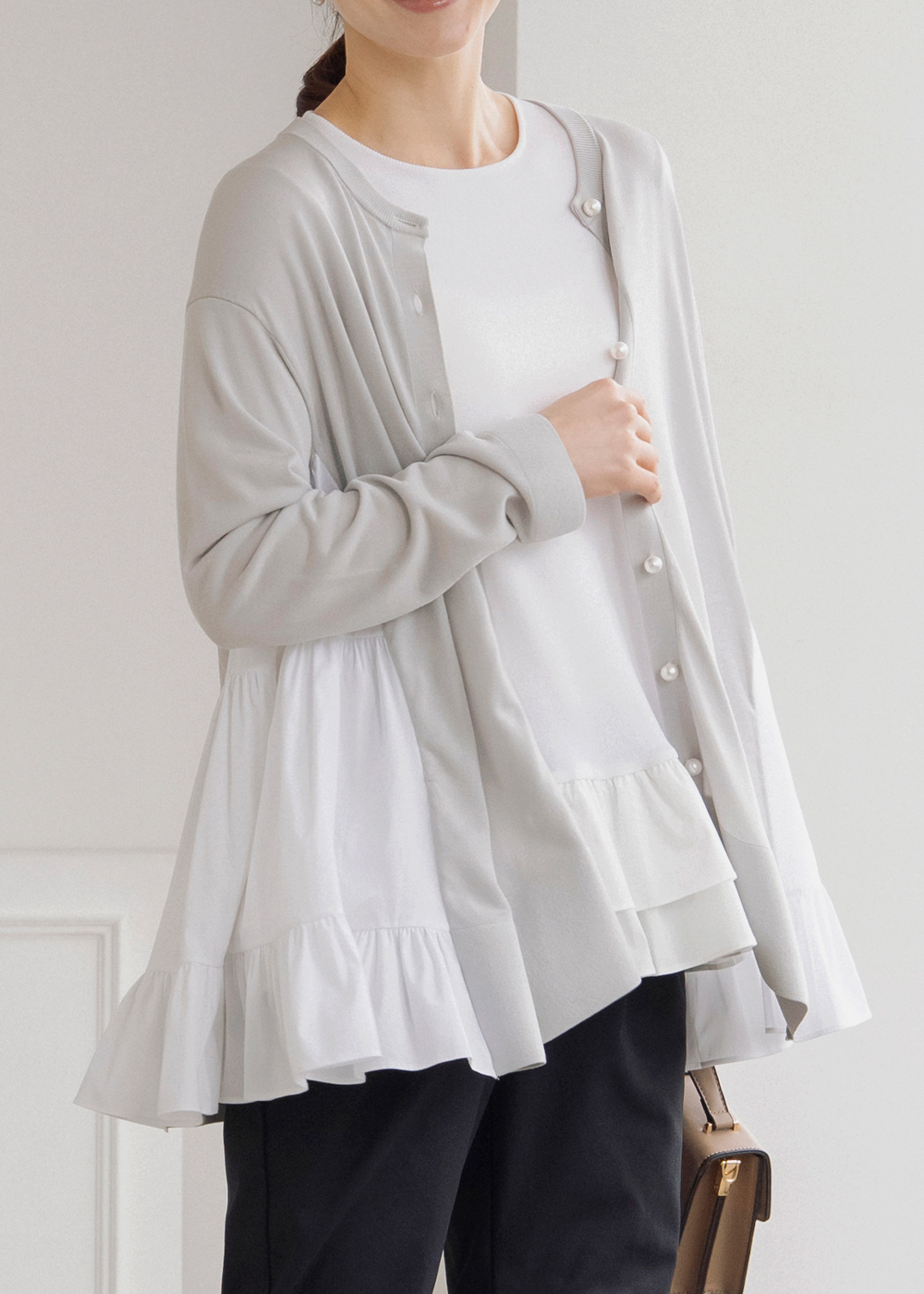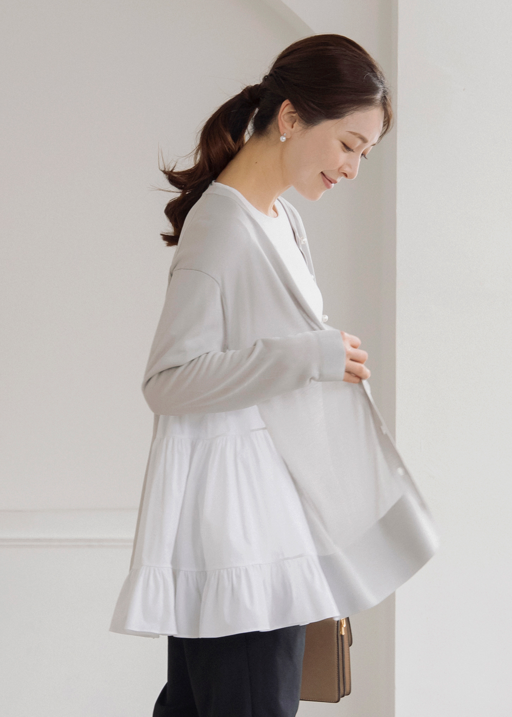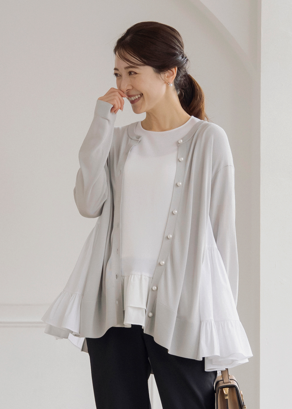 サイドティアードのチュニックカーディガンが後ろ姿まで美しく