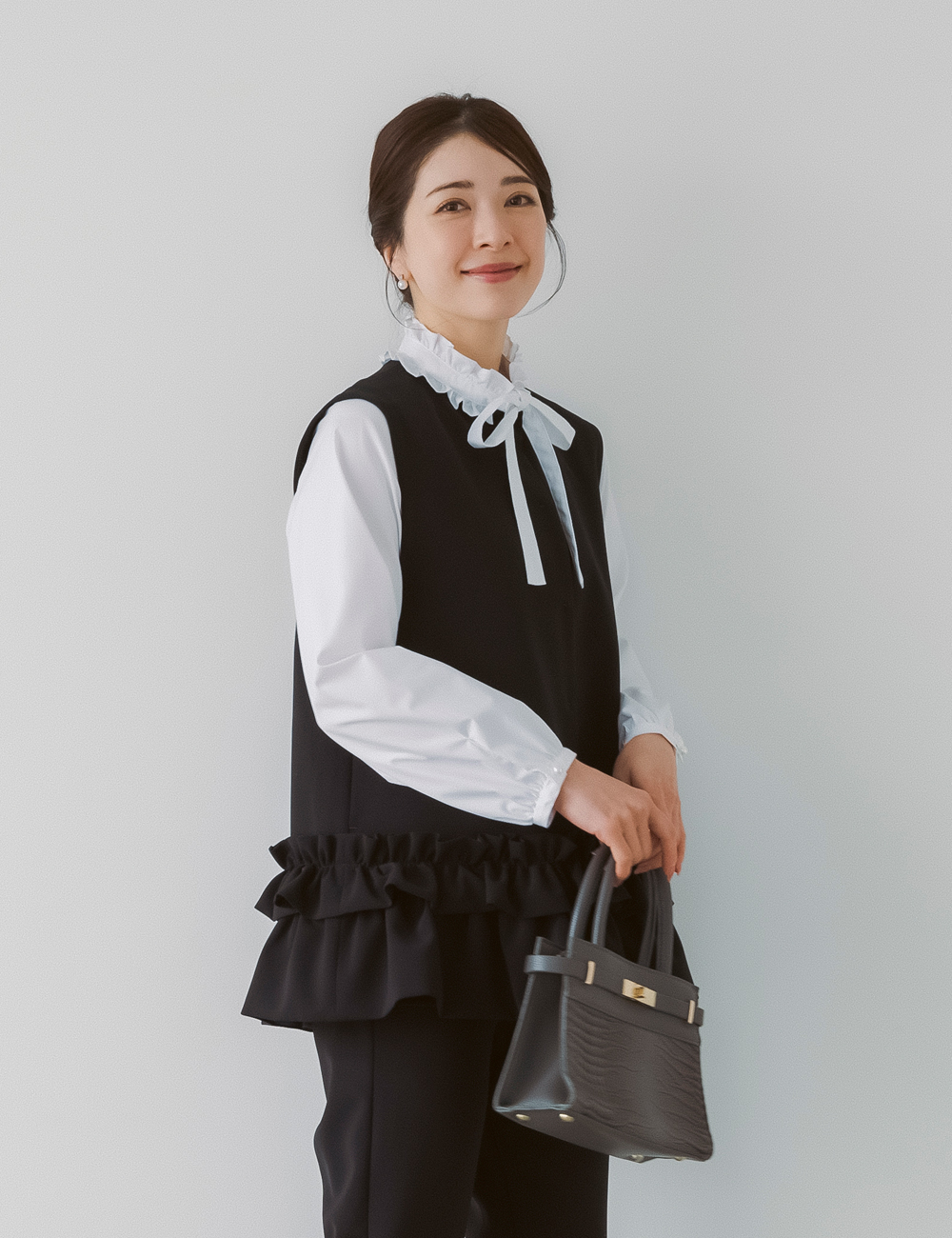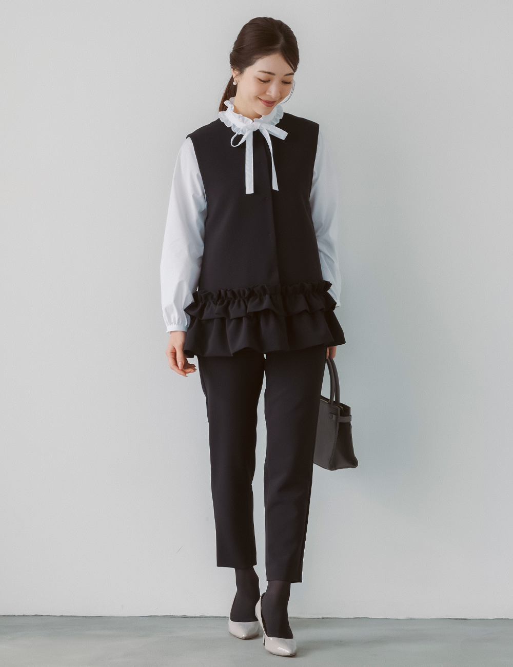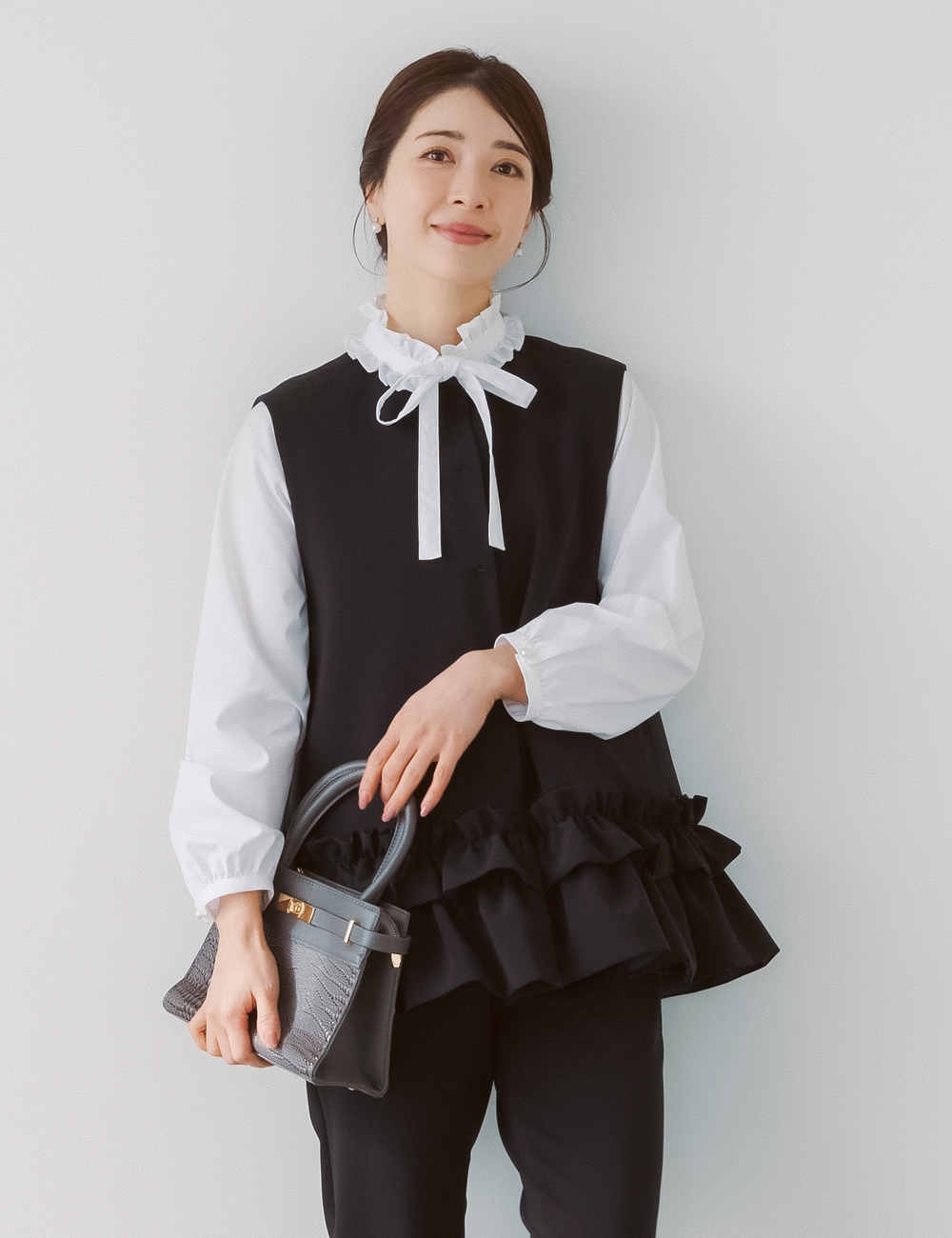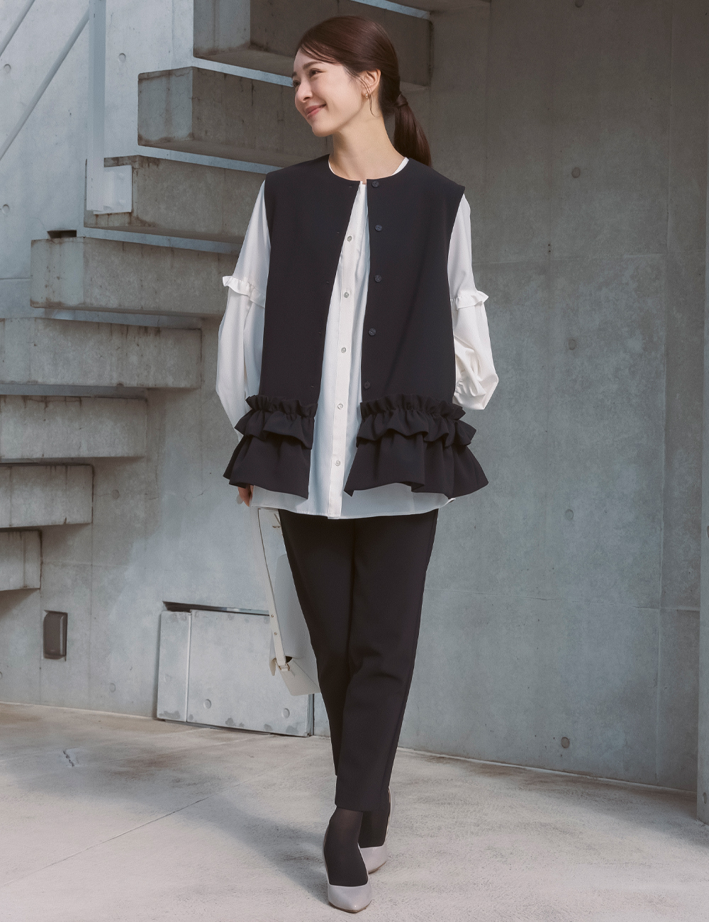 最近はジレやきれいめトップス+パンツという選択も増えています。