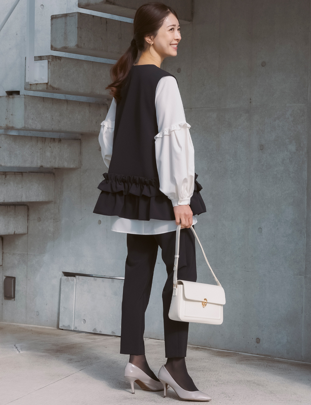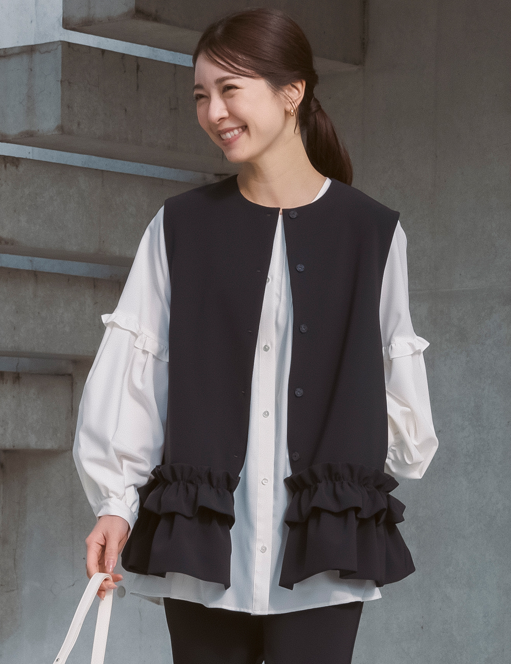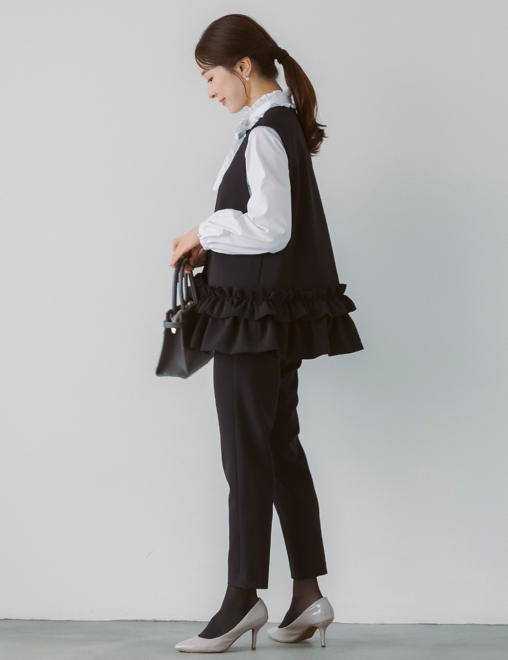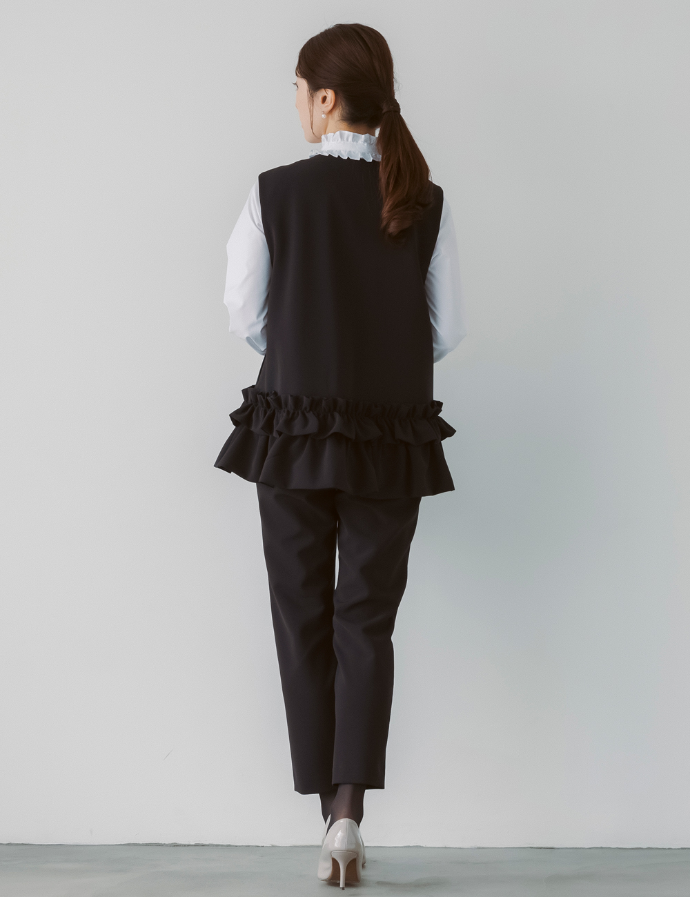最近はジレやきれいめトップス+パンツという選択も増えています。